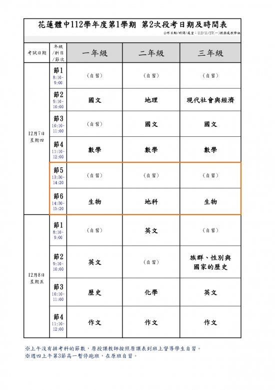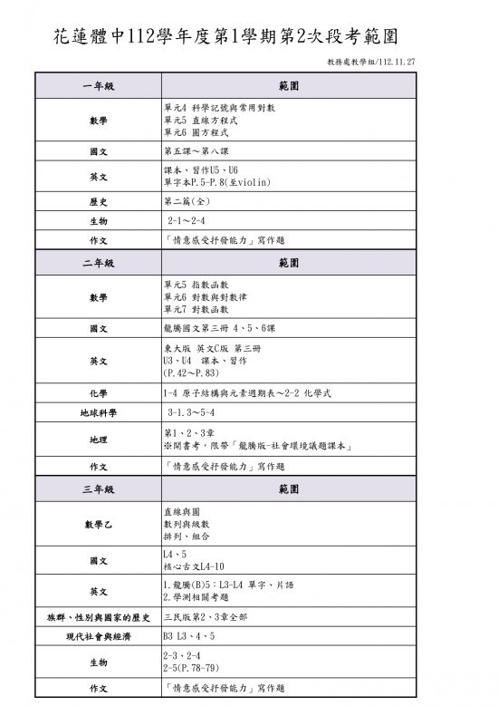 112學年第一學期第二次段考--考試範圍暨考試期程