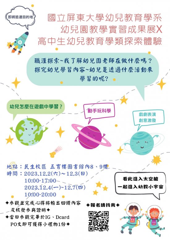 | 四、 | 報名方式:填寫google報名表單https://forms.gle/J7x2Bj89cyN5gbA18或掃描附件海報QR Code(可由校內教師帶隊或個人參觀),參觀完畢並填寫心得將核發參與證明。 |