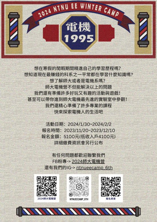 | 說明: | 本次營隊活動日期為113年1月30日至2月2日,預計招收名額為48名,詳細活動辦法請參考附件,亦可點選連結https://www.facebook.com/profile.php?id=61553609271399 或是 https://www.instagram.com/ntnueecamp_6th/ 查詢。 |
