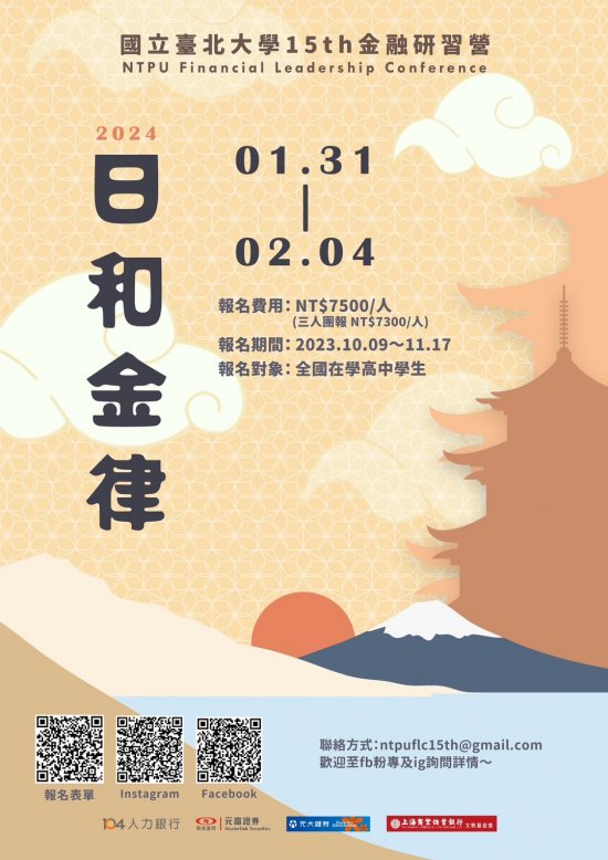 | 三、 | 敬請協助公告本校金融研習營資訊於貴校大學營隊資訊。如對本系金融研習營有任何疑問,可參考國立台北大學金融研習營Facebook粉專https://www.facebook.com/ntpufcm5 Instegram粉專https://instagram.com/2024_ntpu_flc_?igshid=MzRlODBiNWFlZA==,或聯絡本次活動聯絡人:王望宇 0901019186 / 于上哲 0975076986。 |