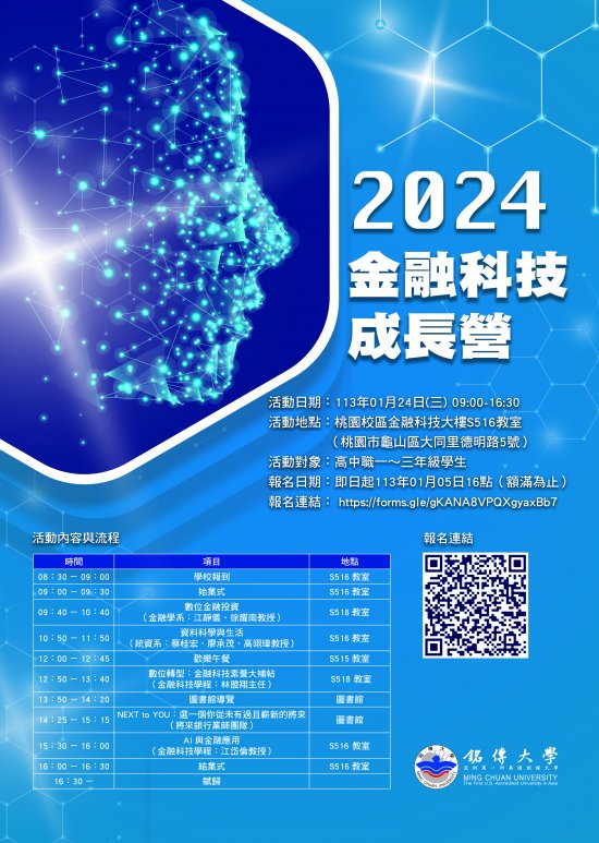 | 二、 | 請於113年01月05日前,至「銘傳大學金融科技學院」首頁瀏覽活動詳情(https://fintech.mcu.edu.tw/)與報名(https://forms.gle/apSBTj31Z5eA2btX6)。 |