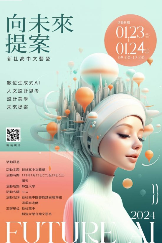 | 一、 | 本校台灣文學系於寒假辦理文學營隊,2024年以「向未來提案」為題,運用「數位生成AI」,進行人文設計思考及設計美學創發,讓學生由文字進行文學轉譯,向「未來」提案。 |