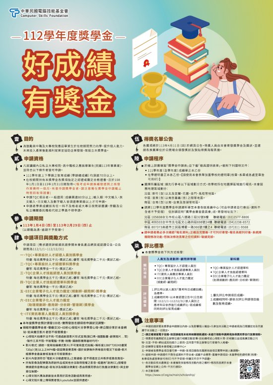 轉知「112學年度財團法人中華民國電腦技能基金會獎學金」申請相關訊息