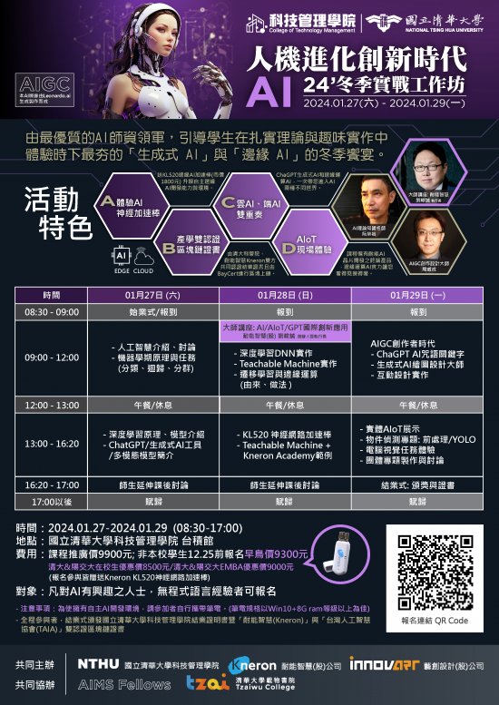| 二、 | 為期三日的工作坊,邀請到最優質的AI師資領軍,引導學生在扎實理論與趣味實作中,體驗時下最夯的「生成式AI」與「邊緣AI」的冬季饗宴。 |