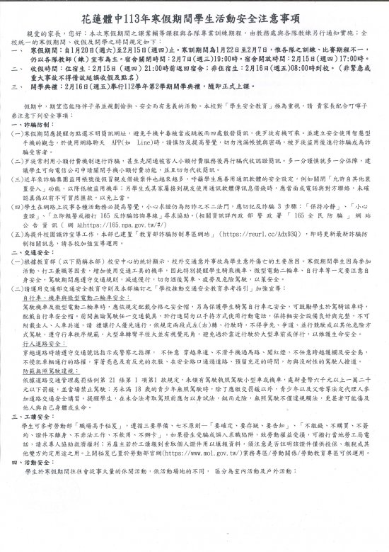 - 收假時間:住宿生:2月15日(週四)21:00時前返回宿舍;非住宿生:2月16日(週五)08:00時到校。(非緊急或重大事故不得借故延誤收假及點名)