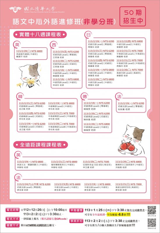 一、 | 為培育國際溝通力,辦理各類語文課程。50期外語推廣課程內容包涵英、日、韓、法、德、及西等六國語言,各類課程資訊請詳見:https://language.site.nthu.edu.tw/p/412-1212-21191.php?Lang=zh-tw |