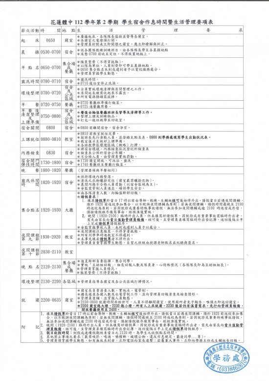 花蓮體中112學年第2學期 學生宿舍作息時間暨生活管理要項表