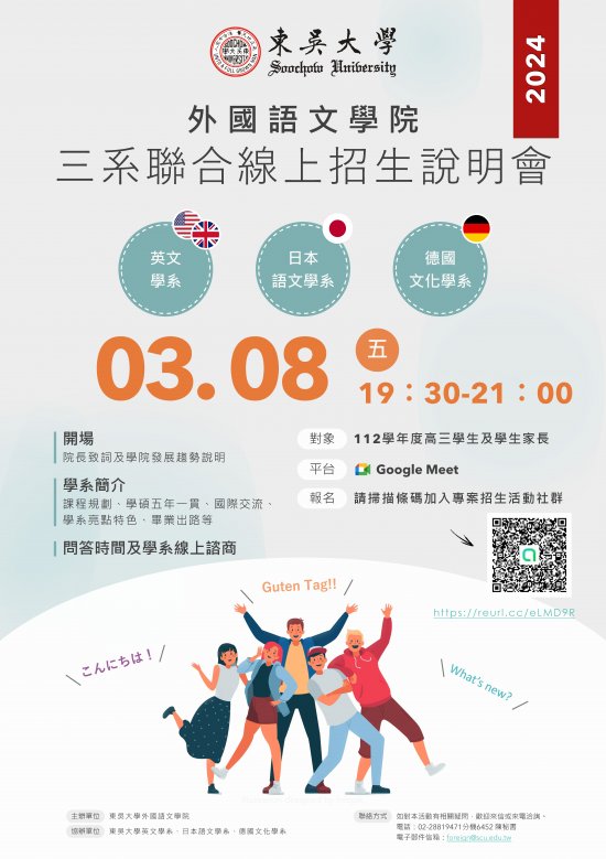 三、 | 報名以上說明會及有意報考相關學系者,歡迎加入「112學年度東吳大學外國語文學院英文系、日文系與德文系聯合線上招生服務線上招生服務LINE社群」 https://reurl.cc/eLMD9R |