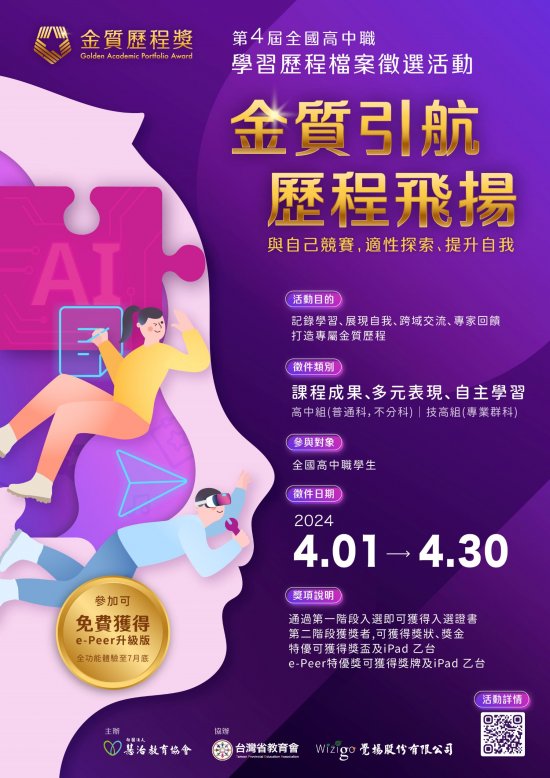 一、 | 社團法人慧治教育協會為了促進跨校交流,並提供學生展現自我的舞台,特舉辦全國高中職學習歷程檔案徵選活動【金質歷程獎】,鼓勵學生實踐所學,豐富學習歷程檔案,除了可獲得書審老師給予的實質回饋、了解學習歷程檔案製作的重點之外,獲獎學生也有機會受邀公開分享作品成果,培養邏輯思考及口語表達能力,奠定自主學習的基礎,是一個與自己的競賽,進而適性探索、提升自我的機會。歡迎貴校教師鼓勵學生參與,凡報名參加的學生皆能免費使用e-Peer共學平臺升級版記錄學習軌跡、彙整亮點成果,將學習經驗打造成金質歷程! |