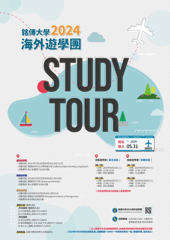 二、 | 活動內容如下: (一)活動日期:113年7、8月。 (二)活動地點:美國加州州立大學長堤分校、韓國西京大學及泰國正大管理學院。 (三)參加對象:應屆高中(職)畢業以上,英文能力不拘。 (四)活動網址:https://studytour.mcu.edu.tw/ |
