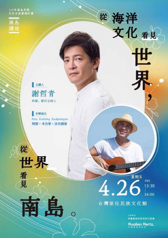 著重於南島文化交流,融合國際視野,特舉辦10場次的南島講座,邀請國內外大師級專家學者以及花蓮在地知名歌手等人士共同交流分享。首場主講人為擁有「行走的百科全書」 之稱的作家、節目主持人謝哲青先生,將帶領觀眾一起認識南島,為本縣帶來豐富多彩的文化盛宴,進而推動「花蓮走向世界、世界走進花蓮」,促進地方經濟及提升花蓮國際能見度,合先敘明。