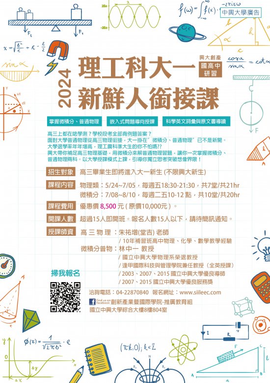 (一) | 《理工科大一新鮮人銜接課》讓興大來幫幫忙你克服微積分與普通物理噩夢。課程將補足高三物理基礎,用微積分來解普通物理習題,並帶學生提前熟悉科學英文詞彙與原文書導讀,讓學生一次掌握,拒絕大學恐慌症。 |