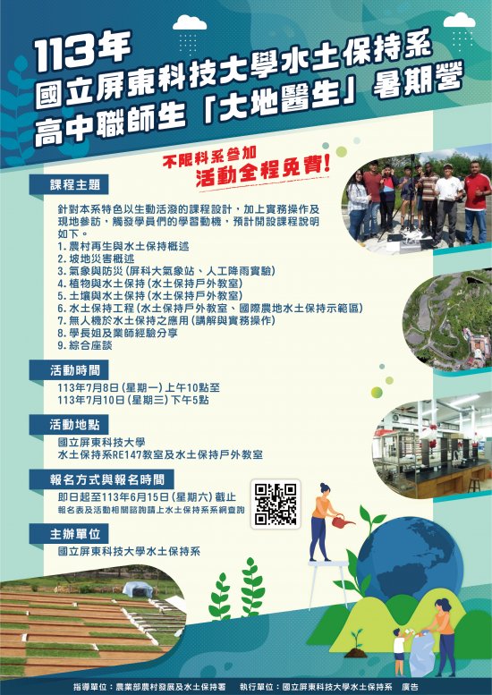 三、 | 暑期營活動全程免費(含住宿及用餐),名額有限,額滿為止,活動詳情及報名表電子檔請自行至本系系網(活動訊息)下載: http://swc.npust.edu.tw/?act=news&cmd=list,填寫完之報名表mail至s w c 7 0 6 9 @ m a i l . n p u s t . e d u . t w 即可報名成功。 |