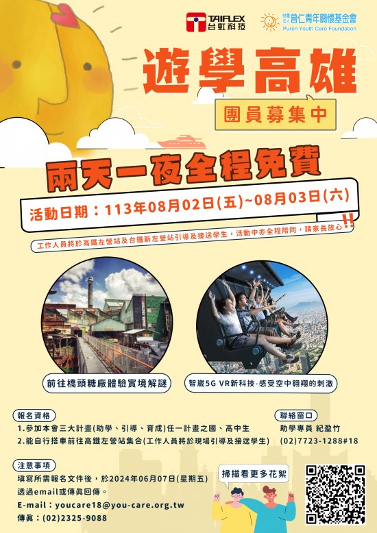 一、 | 本會將於113年08月02日(五)至08月03日(六),舉辦2024年遊學高雄青少年體驗活動,費用全免,凡參與本會助學計畫、引導計畫或育成計畫之國、高中學生,皆可報名。 |