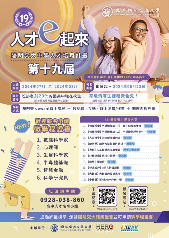 三、 | 計畫內容:第十九期開課計畫包含(1) 物理科學人才培育計畫、(2) 人文社會人才培育計畫、(3) 統計學人才培育計畫、(4) 資訊人才培育計畫、(5) 心理諮商人才培育計畫、(6) 數學人才培育計畫、(7) 程式設計人才培育計畫、(8) 大數據人才培育計畫、(9) 財經人才培育計畫、(10) 中醫藥人才培育計畫。可參考附件一報名簡章各科開課說明,請詳閱計畫網站https://ewanths.nycu.edu.tw各計畫課程說明。 |