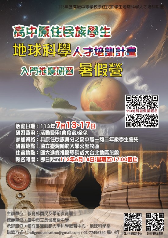 一、 為培訓具地球科學研究性向或興趣之高級中等教育階段原住民族學生,加強其科學基礎及實驗操作能力,以培育其成為原住民科學人才,以期未來回饋社會,協助推動原鄉科學教育。