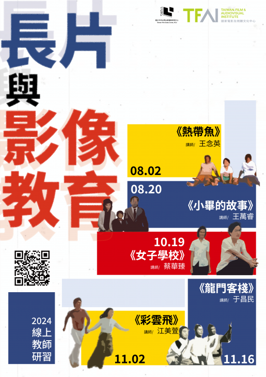 二、 | 「長片與影像教學:2024線上教師研習」系列課程,網羅臺灣60年代武俠片、70年代愛情文藝片、80年代青少年電影以及90年代的寫實喜劇片,從電影史角度出發,邀請新一代電影學者,以五堂課進行不同時代和風格的深度電影解析。(五堂為獨立課程,可自由單複選報名) |
