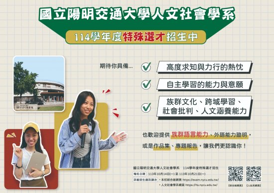 四、 | 報名詳情請洽本校綜合組特殊選才網頁(https://exam.nycu.edu.tw/std-bspc.php)。 |