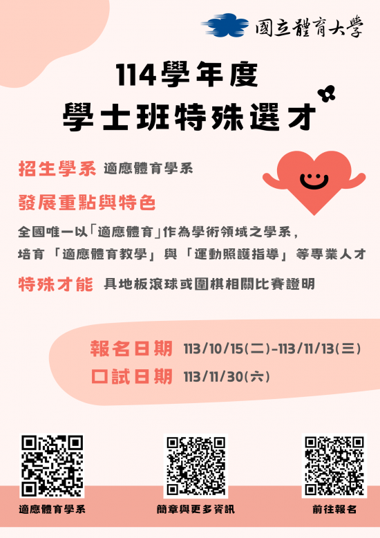 一、 | 旨揭招生學系為本校適應體育學系(網址: https://ape.ntsu.edu.tw/) |