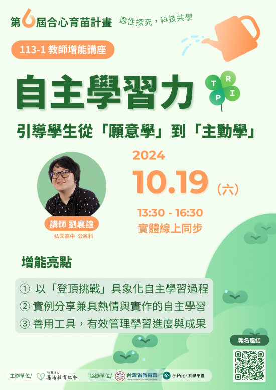 活動資訊:(一)主題:自主學習力:引導學生從「願意學」到「主動學」。(二)時間:113年10月19日(星期六)下午13時30分至16時30分。(三)活動形式:虛實整合,實體與線上同步進行。(四)參與對象:全台高中職教師。(五)研習時數:每場提供3小時的研習時數,如需研習時數可於回饋單留下身分證字號,以利後續作業。(六)報名方式:採線上報名,即日起至10/18中午12:00截止。 |