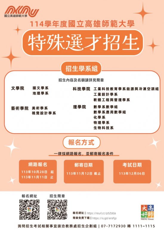 二、 | 特殊選才招生學系:國文學系、地理學系、美術學系、視覺設計學系、數學系(數學組、應用數學組)、化學系、物理學系、生物科技系、工業設計學系、工業科技教育學系(能源與冷凍空調組)、軟體工程與管理學系、軟體工程與管理學系(資安外加)等13個校系組,提供27名招生名額。 |