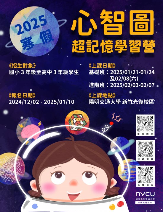 一、 | 旨揭親子免費講座(含線上)共兩梯次,時間訂於:113年11月16日及12月29日;營隊課程時間訂於114年1月21日至2月8日止。詳細課程資訊與報名繳費請至本校推廣教育中心網站:https://cec.nycu.edu.tw/Category/3查詢。 |