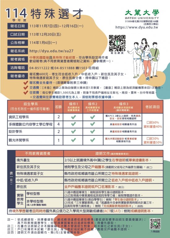 五、 | 各系報考資格,請參閱招生文宣並詳閱招生簡章資訊。考生符合「低收入戶、中低收入戶、新住民及其子女、特殊境遇家庭子女或原住民身分者」,本校另有免報名費或交通與住宿費之補助,敬請師長踴躍推薦所屬學生報考。 |
