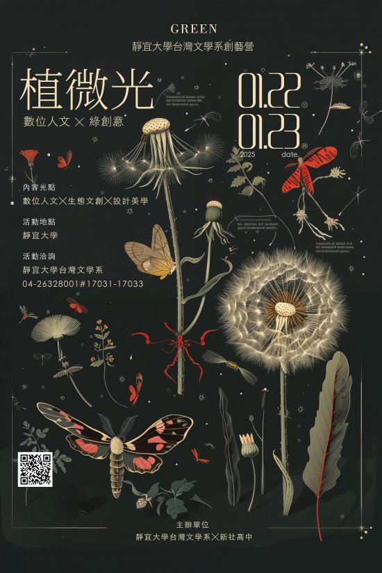 一、 | 本校台灣文學系於寒假辦理創藝營隊,2025年以「植微光-數位人文x綠創意」為題,以「永續創新」為核心理念,嘗試結合數位科技與生態文創,結合環境美學、數位科技與創意實作,提供參與學生全新的學習體驗。 |