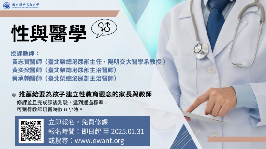 一、 旨揭課程由黃志賢醫師主授(臺北榮民總醫院泌尿部主任、國立陽明交通大學醫學系教授),邀集臺北榮總的專業泌尿科主治醫師,以生殖醫學出發,製作「性與醫學」全線上數位課程,以利推動正確的衛教資訊。