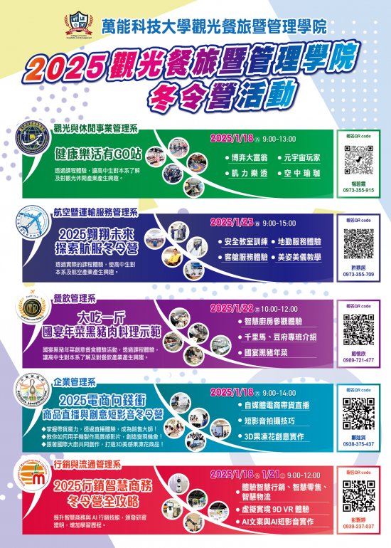 一、 | 為提供高中職校學生探索大學課程之機會,發展學生潛能,落實因材施教適性揚才之目標,本校觀光餐旅暨管理學院各系將於114年1月份辦理2025冬令營活動,活動文宣如附件,相關活動時間及報名網址如下: |