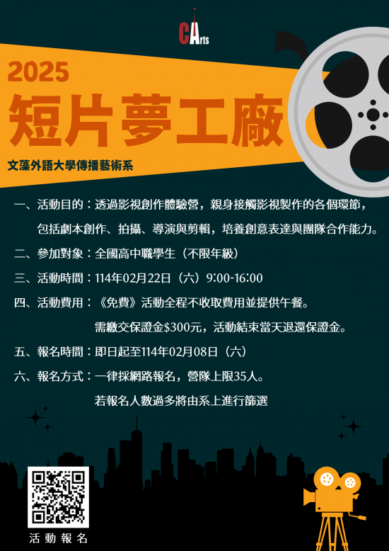 三、 | 本活動以完整的影視製作流程為主軸,強調學員親身參與及實作練習,從劇本創作到作品完成,提供全方位的影視製作體驗,活動詳情請參考附件簡章、海報或至本校傳播藝術系網站查詢。 |