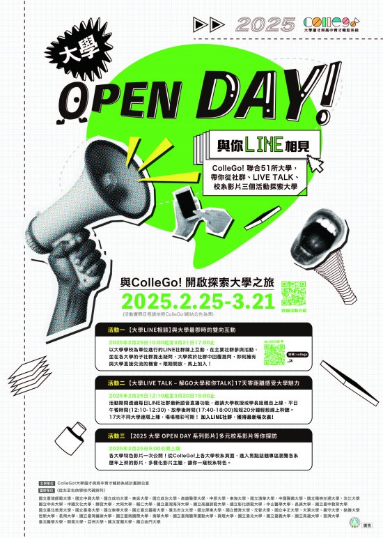 活動三、【2025 大學 OPEN DAY 系列影片】:由協辦大學之校系提供,為本次活動特別製作之特色影片,將於ColleGo!學系頁面及焦點話題專區聯合播出。 |