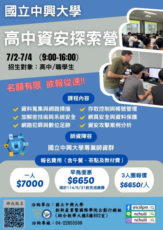 五、 課程費用:114年5月31日前報名並完成繳費者享有早鳥優惠價新台幣6,650元整。