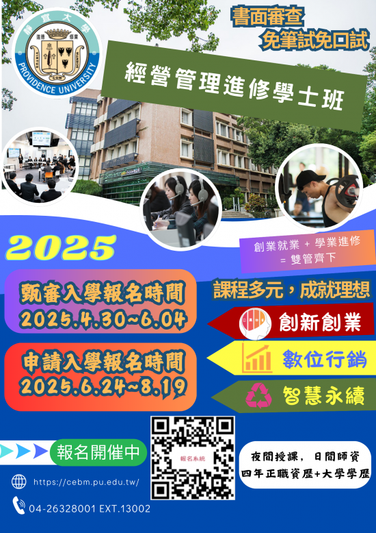 三、 有關招生資訊可參閱本校進修學士班招生專區網頁,網址:https://adms.pu.edu.tw/p/426-1123-24.php?Lang=zh-tw歡迎貴校師生多加參考。