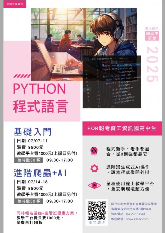 | (二) | 《Python程式設計系列基礎入門/進階爬蟲班》,想靠程式加身以APCS加分報考資工系所,還有超熱門的 生成式 AI 協作技巧,從0到強都靠它!讓這堂課成為你的黃金跳板! |