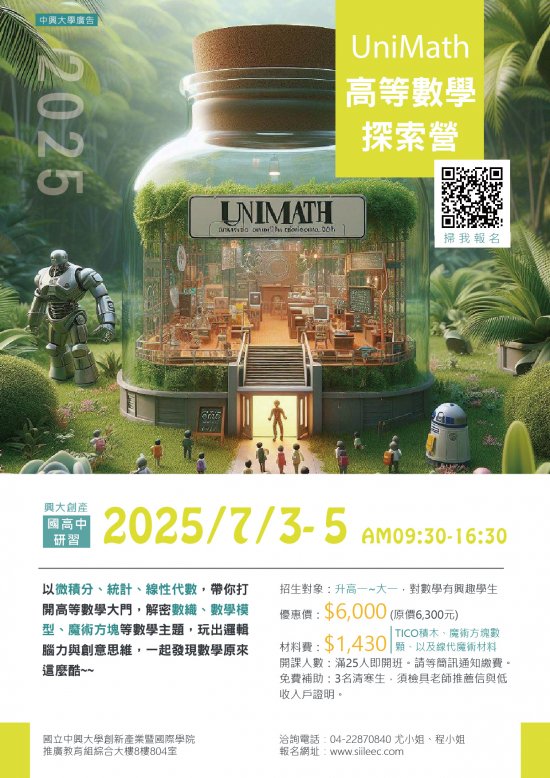 | (一) | 2025 UniMath 高等數學探索營:期間2025年7月3日至7月5日三日營。 |