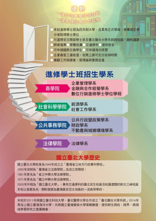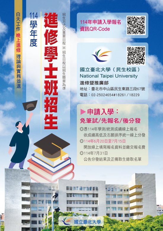 | 四、 | 本校今年網路報名相關資訊及連結請參閱:https://new.ntpu.edu.tw/eec/bachelor-continuing。 |