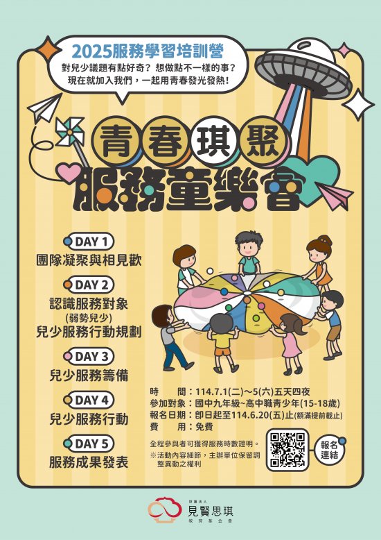 一、 | 為提供青少年社會參與機會,並增進其對兒少議題的關注與認識,本會規劃辦理「2025青春琪聚-服務童樂會」暑假服務學習培訓營;內容涵蓋團體凝聚、認識弱勢兒少、服務行動規劃與執行、服務反思及成果發表等活動,透過做中學的模式,培養青少年品德素養能力,歡迎有服務熱忱的青少年踴躍參與。 |