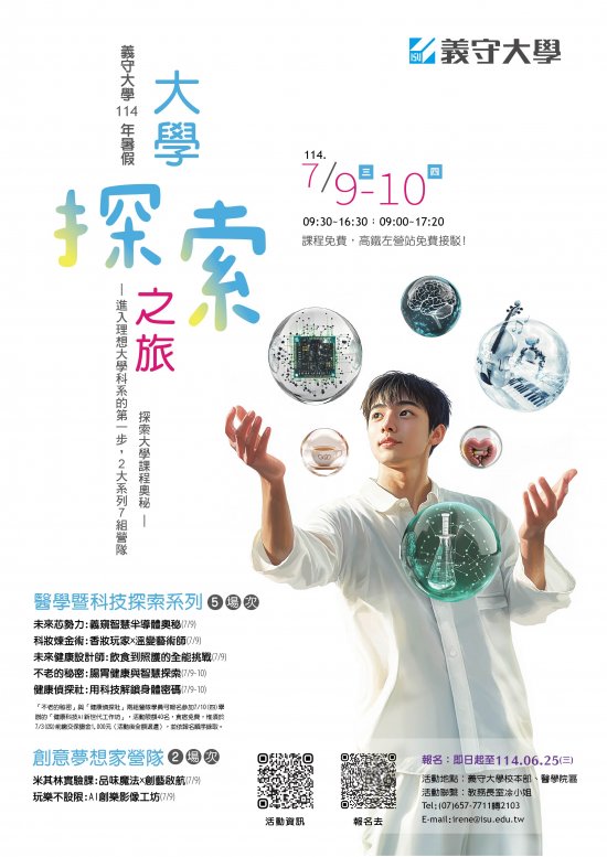 一、 | 為引導高中生提早探索大學學科,接觸跨領域知識,培養創新思維與解決問題的能力,並為未來的大學學習打下良好基礎,協助其更有方向地選擇適合的科系。本校爰於暑假期間推出一系列結合智慧科技、醫學探索與跨域學習的「大學體驗營」活動,活動分為「醫學暨科技探索營隊」及「創意夢想家營隊」2大系列共計7組營隊,營隊介紹及活動文宣詳如附件。 |