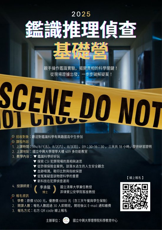 一、 | 本營隊旨在培養國高中學生對鑑識科學之興趣與實務理解,課程結合指紋與鞋印採證、血跡軌跡判讀、現場模擬推理等實作活動,強化學生觀察力與邏輯推理能力,促進跨領域學習與公共安全素養。 |