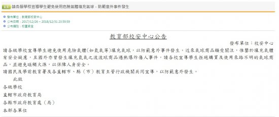 為維護學生安全,宣導避免使用危險氣體(如氫氣等)填充氣球