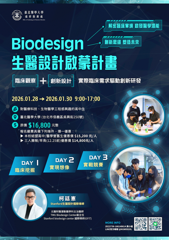 | 二、 | 本課程旨在培養學員對Biodesign醫材開發之基本認知與興趣,學員將透過臨床觀察、需求挖掘、創新設計思維與原型製作基礎實作,體驗自醫療需求識別至方案設計之完整過程,進而強化跨域整合與問題解決能力。 |