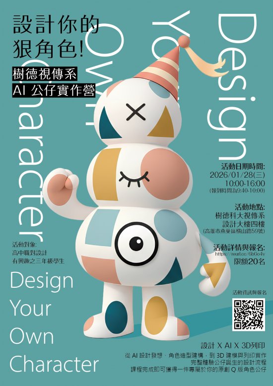 一、 本校視覺傳達設計系寒假冬令活動營「AI公仔實作營」,從AI設計發想、角色造型建構,到3D建模與列印實作,完整體驗公仔誕生的設計流程,課程完成即可獲得一件專屬於你的原創Q版角色公仔,活動一律免費並發給研習證書。