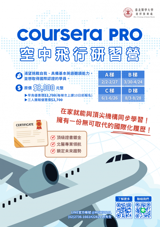 | 一、 | 本校為鼓勵高中學子於寒假期間參與多元學習,將於115年2月2日起辦理【Coursera Pro空中飛行研習課程】4梯次。 |