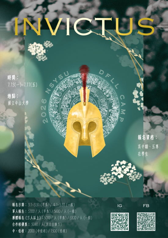 | (六) | FB粉絲專頁「2026 中山外文營 Invictus 」https://www.facebook.com/share/18SdZJBo7E/?mibextid=wwXIfr |