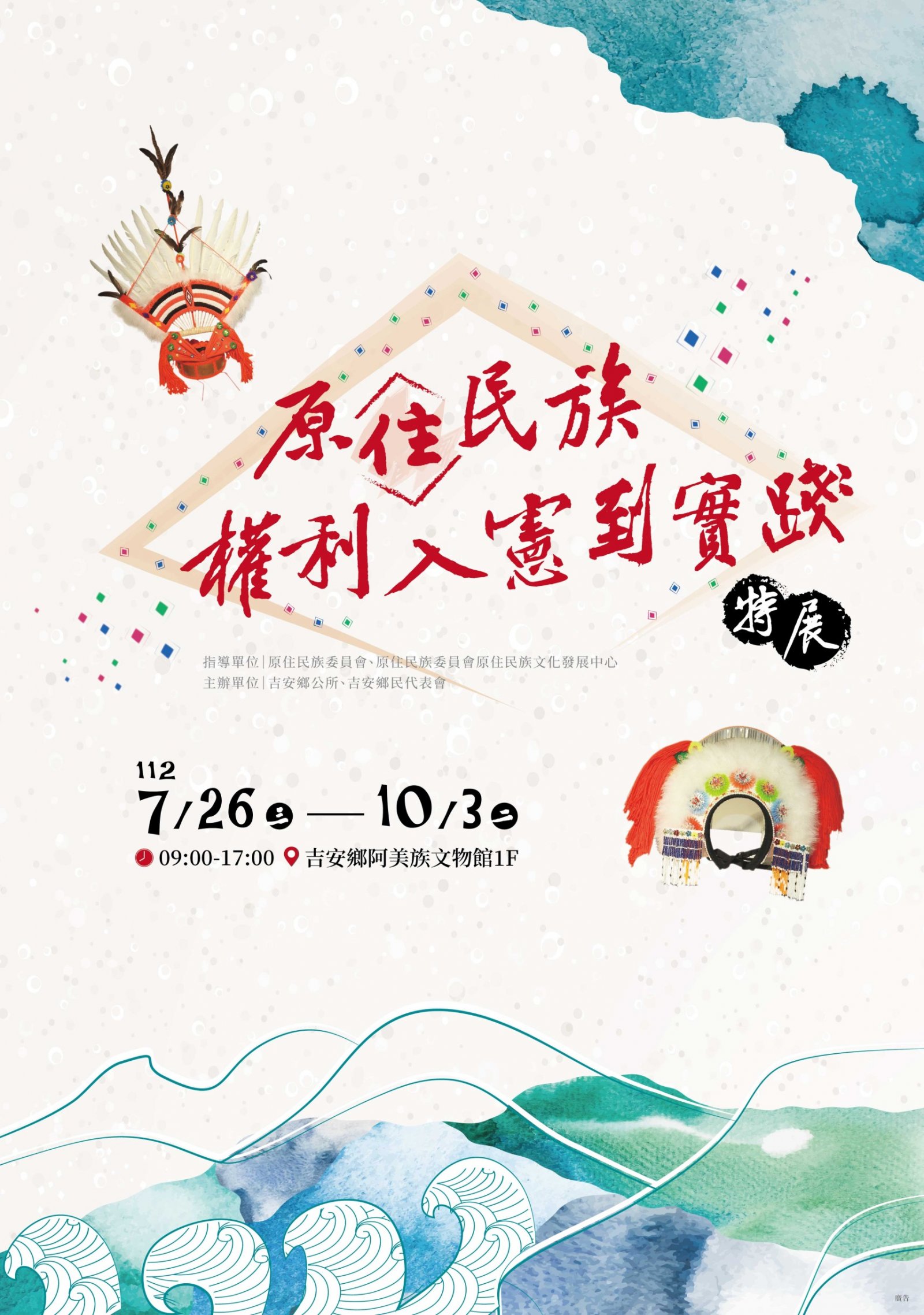 | 一、 | 花蓮縣吉安鄉阿美族文化館辦理「原住民族權利入憲到實踐-巡迴特展」以文字展板敘述族人從「山胞」到「原住民」稱呼的爭取歷程;另一檔展覽為「時代演進傳統到創新-原住民族服飾及配件展」展示花蓮縣六大族群服飾演進過程,呈現出原住民族群的生活智慧與藝術創意。 |