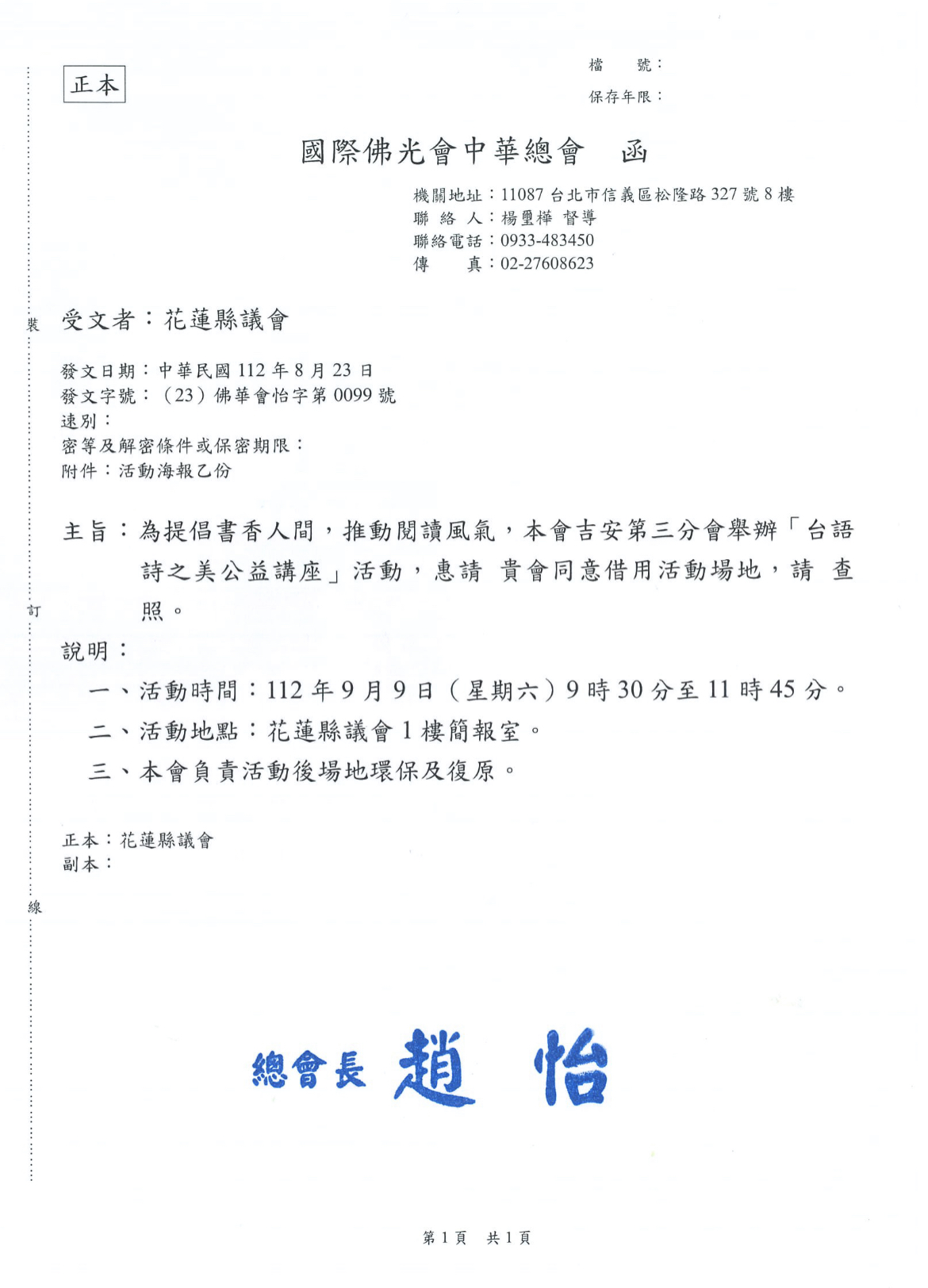 1) 轉知國際佛光會中華總會(簡稱該校)辦理「台語詩之美公益講座」活動。附件2.jpg