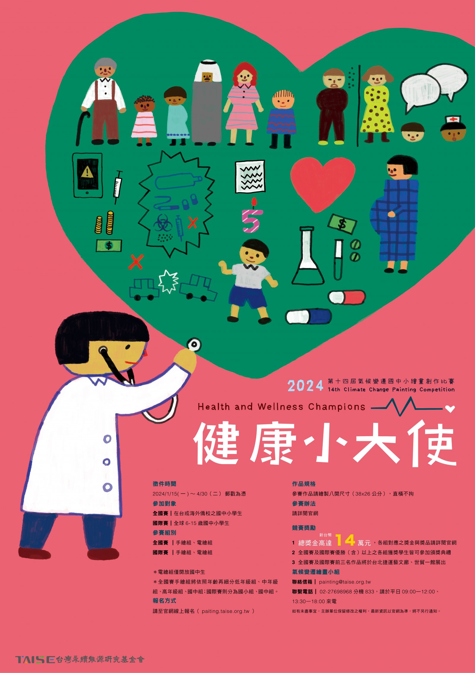 | 一、 | 本會主辦之「氣候變遷國中小繪畫創作比賽」迄今已舉辦13屆,累計43國、65,352名學子參與。本屆(第14屆)為呼應聯合國永續發展目標(SDGs)的第3項,「健康與福祉」,以「健康小大使」為主題,提升師生對傳染疾病的認知並共同探討如何預防,同時學習健康的生活方式、情緒管理等,藉以充分了解SDG 3之各項子目標內容,攜手邁向健康、平安生活。本賽事並積極回應SDG 13「氣候行動」,鼓勵師生改變行為並積極行動,落實相關教育及提升大眾意識。。 |