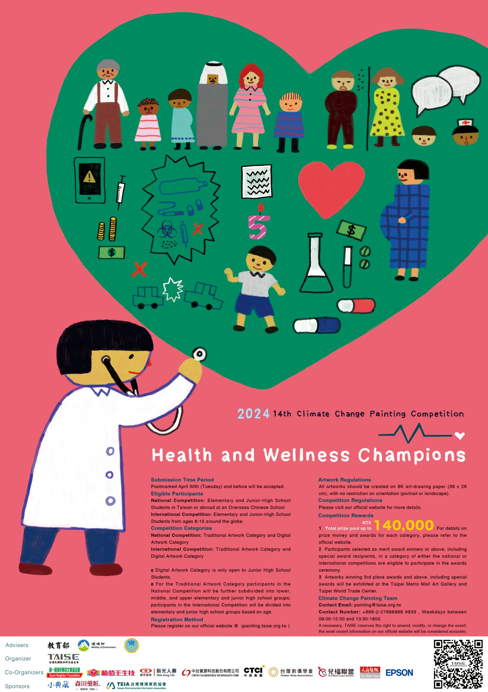 | 一、 | 本屆(第14屆)為呼應聯合國永續發展目標(SDGs)的第3項,「健康與福祉」,以「健康小大使」為主題,提升師生對傳染病的認知並共同探討如何預防傳染疾病;同時學習健康的生活方式、情緒管理等等,亦須充分了解各項子目標的內容,攜手邁向健康、平安生活。此繪畫比賽也呼應第13項,採取氣候行動並提升大眾相關意識。 |