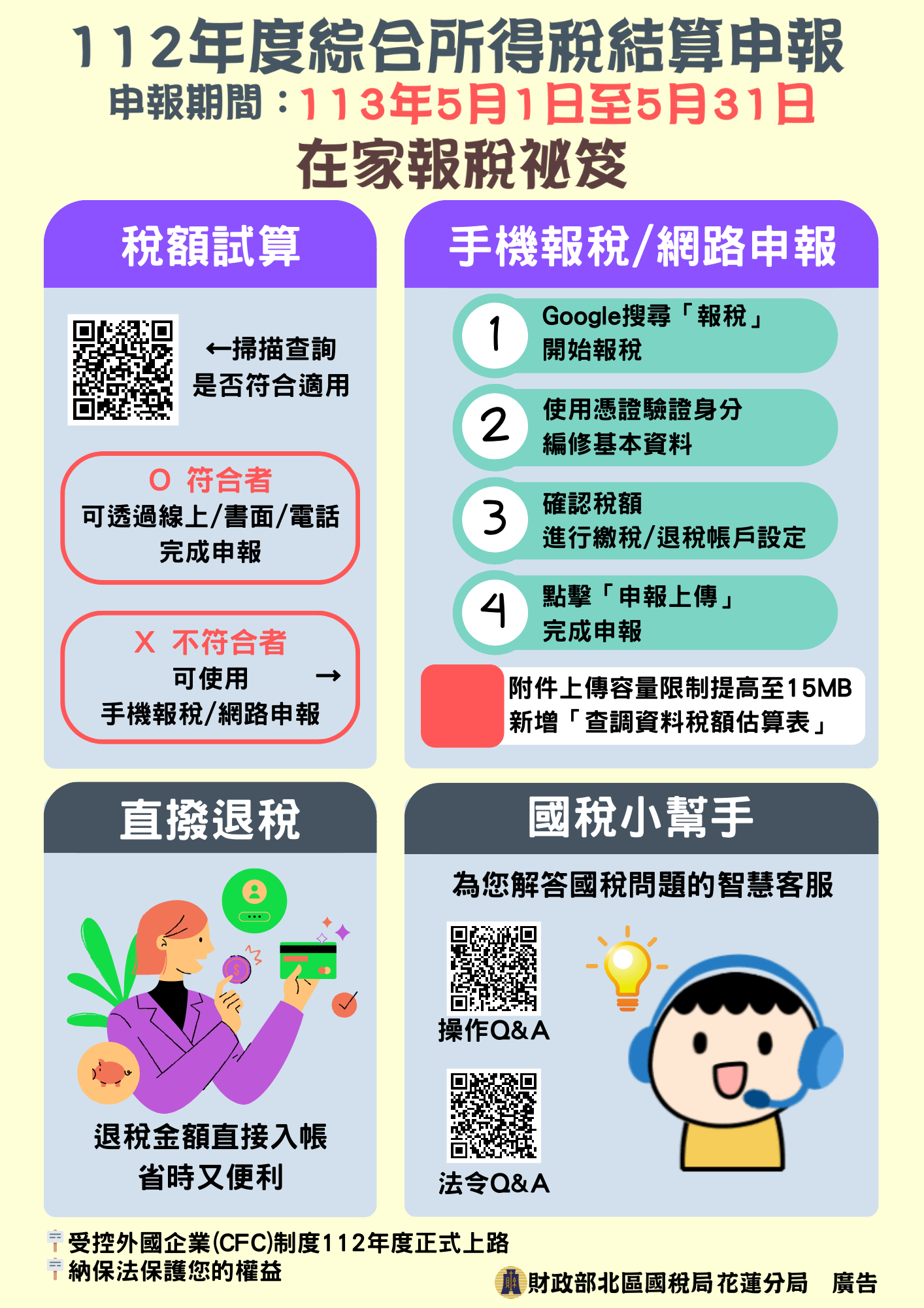 | (一) | 112年度所得稅結算申報期間自113年5月1日起至5月31日止,請儘早申報,以免最後人多擁擠。 |